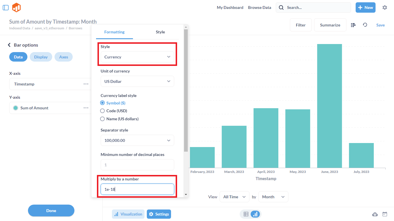 3. Within the formatting options choose the "Style" to "Currency" & in "Multiply by Number" section, Note somewhere the value "1e-18" and then Copy-paste here to convert the value to USD.