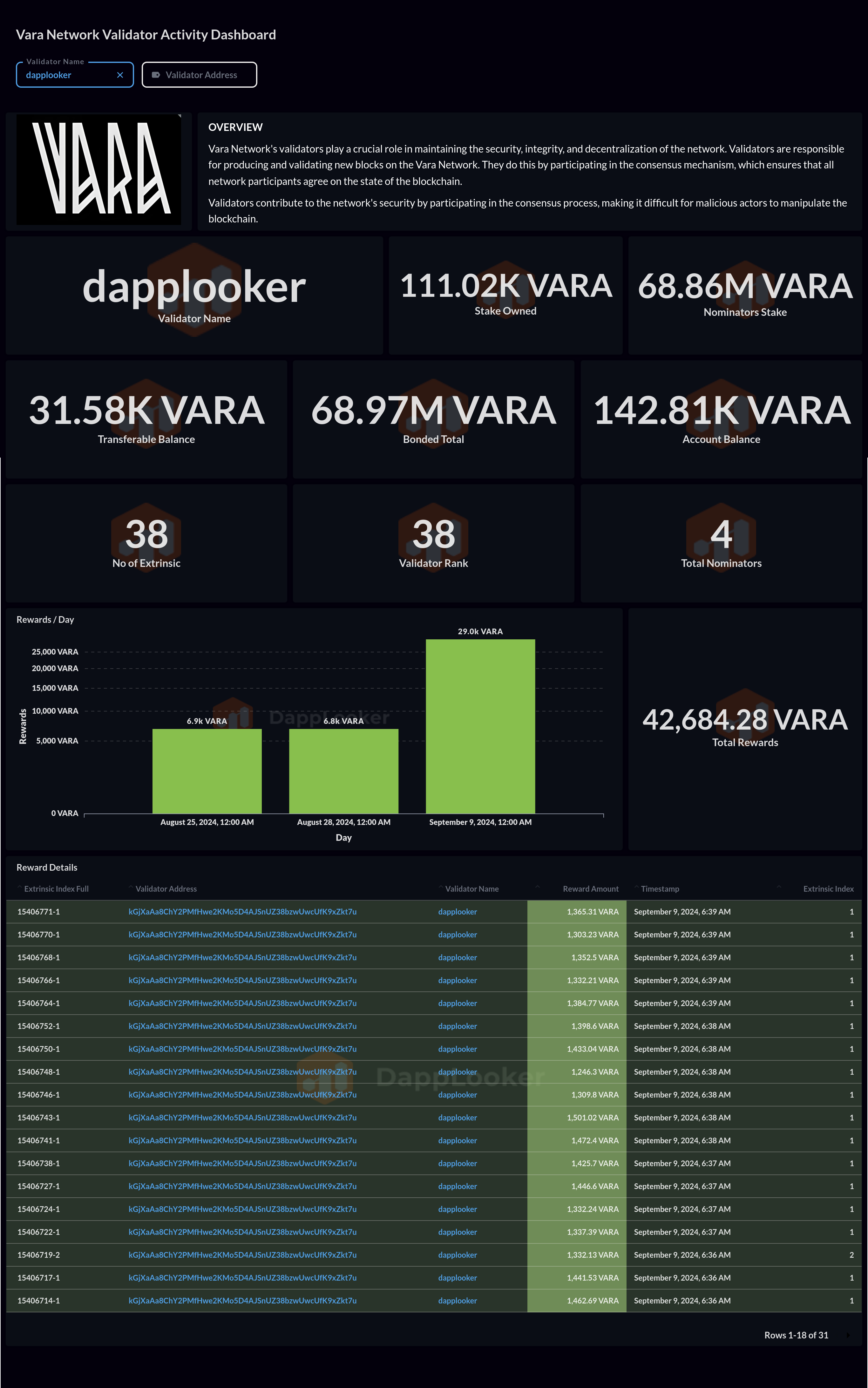 The My Validator Dashboard offers personalized insights into the performance and status of your specific validator on the Vara Network. It tracks key metrics such as uptime, block production, and earnings, helping you monitor and optimize your validator’s operations. The dashboard shows how well your validator is participating in the consensus process, making it easy to see its overall performance and reliability.