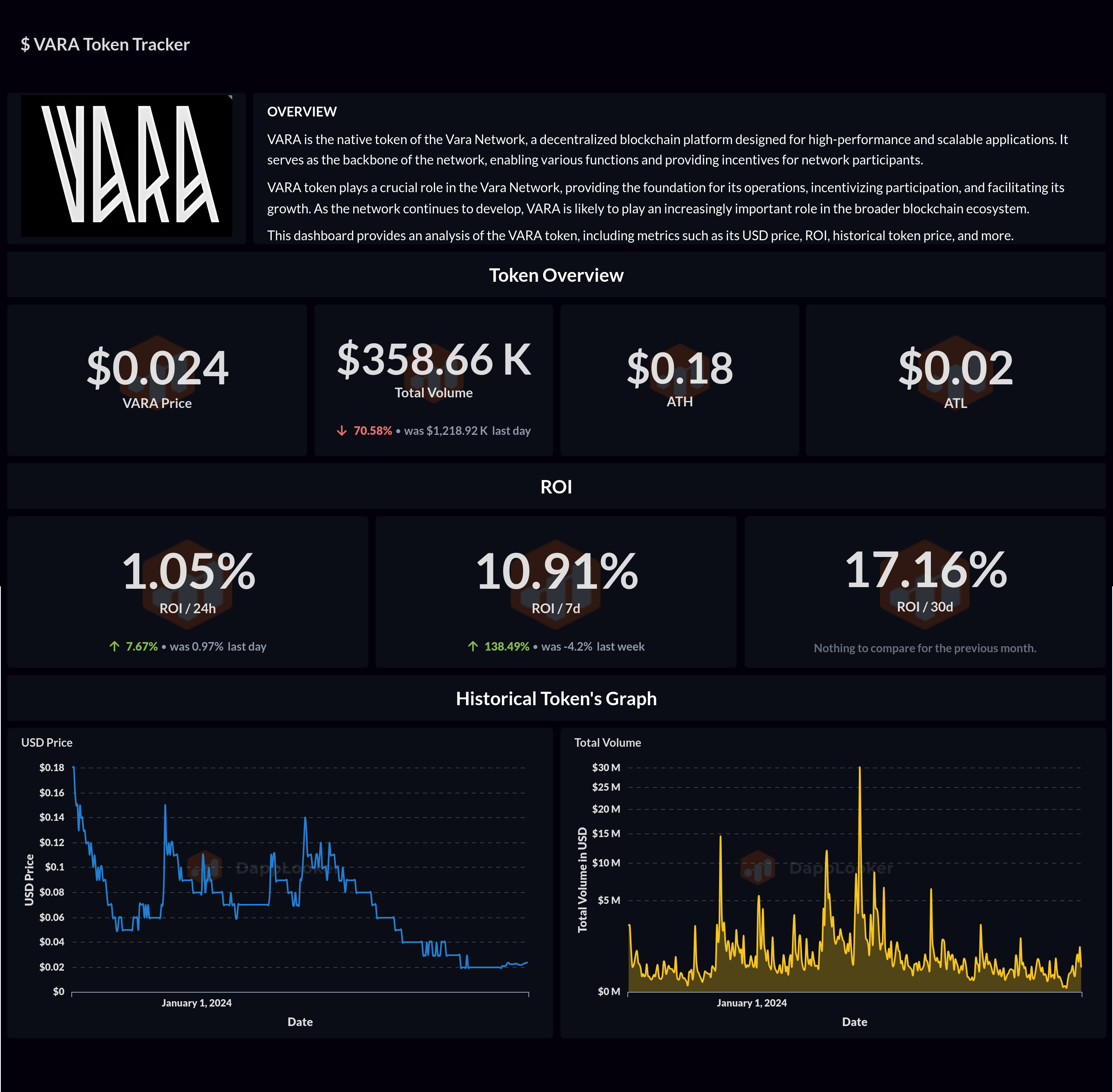 The Token Tracker Dashboard provides real-time insights into token activities on the Vara Network. It tracks key metrics such as USD price, ROI, historical token price, and more. Users can monitor token distribution, identify top holders, and analyze transaction trends. This dashboard is a valuable resource for anyone looking to understand token dynamics, helping users stay informed about token performance and movements within the network.